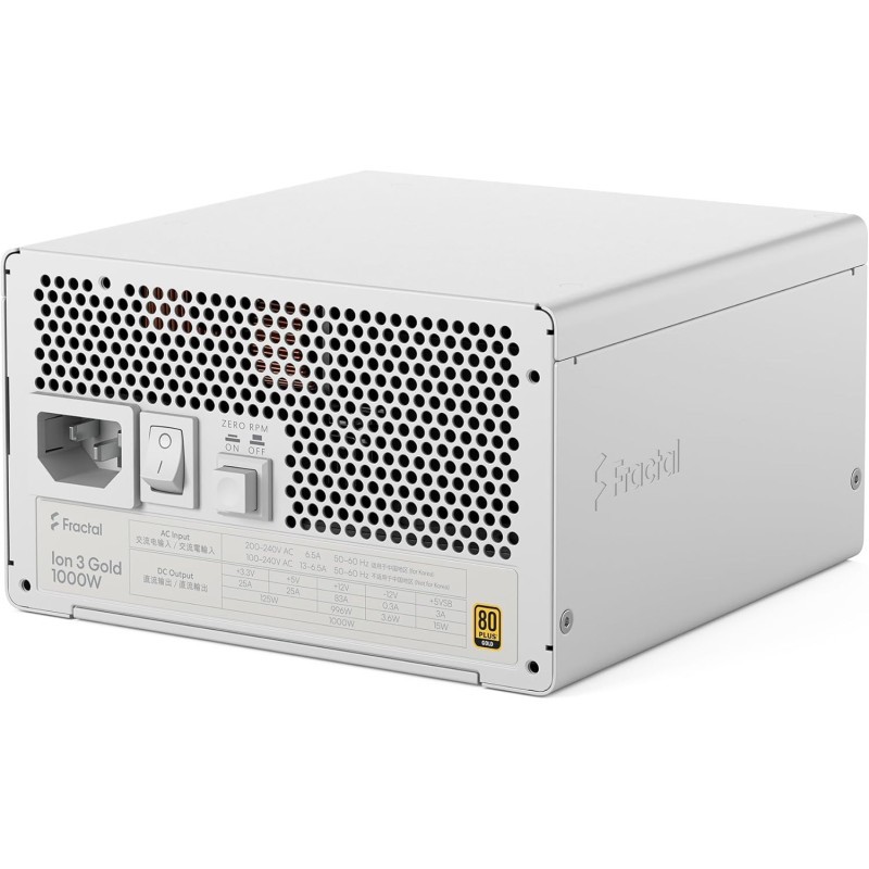 La FRACTAL Ion 3 Gold 1000W Blanc bénéficie de la certification 80 PLUS Gold, garantissant un rendement énergétique élevé. Cette caractéristique permet de limiter la perte d’énergie et de réduire la production de chaleur, tout en optimisant la consommation électrique du système.