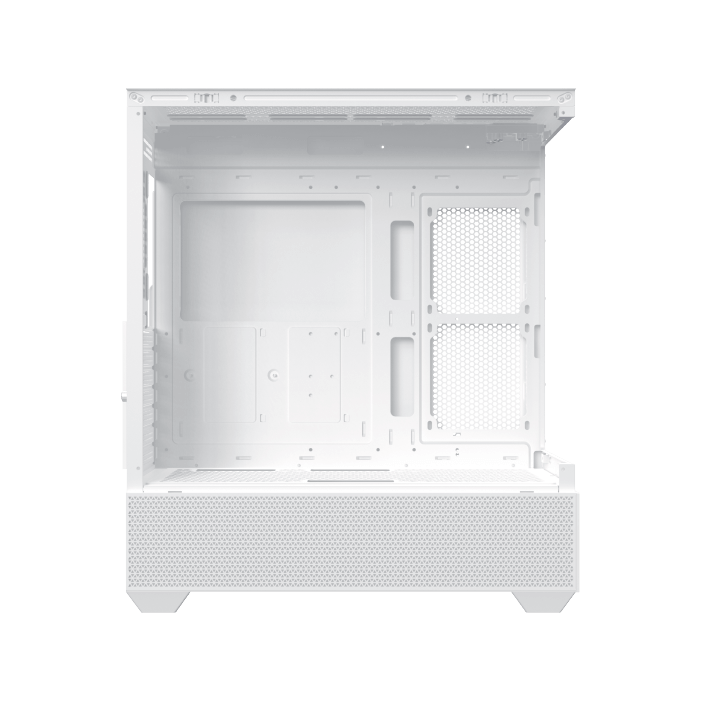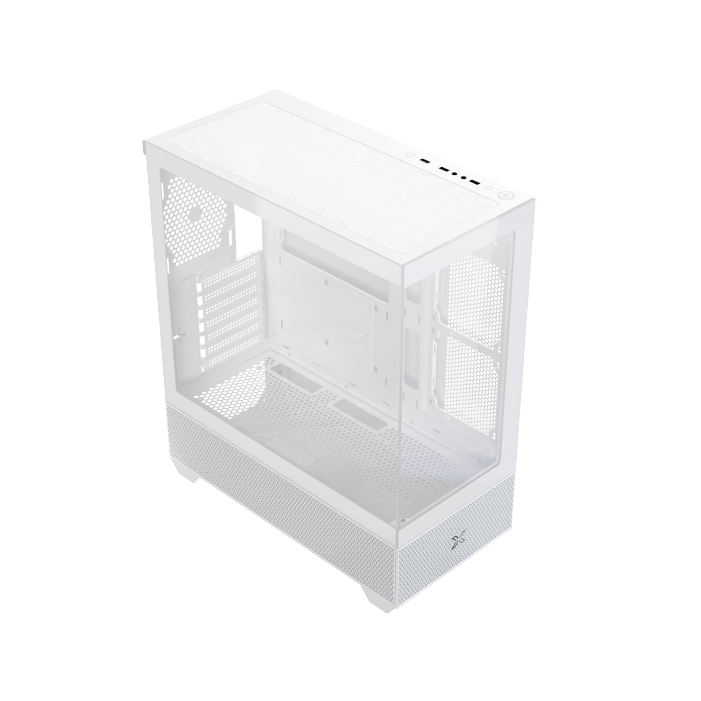 Le boîtier se distingue par ses matériaux robustes : acier, mesh, plastique et verre trempé. Sa façade et ses panneaux latéraux transparents offrent un effet aquarium, mettant en valeur l’intérieur et l’éclairage ARGB adressable.
