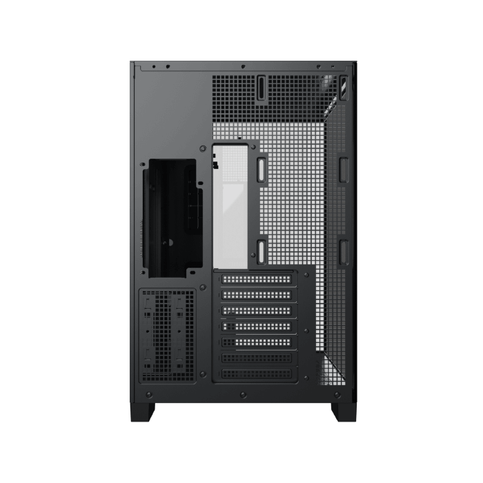 Ce boîtier adopte un style moderne avec une finition noire et des panneaux latéraux en verre trempé. Cette conception met en valeur l’intérieur du PC et facilite l’accès aux composants lors de l’assemblage ou de la maintenance. Les matériaux utilisés, principalement acier et verre trempé, garantissent solidité et durabilité.