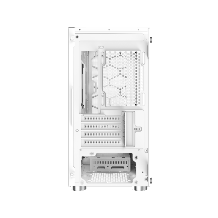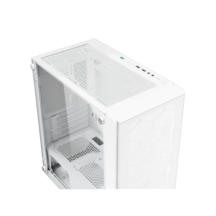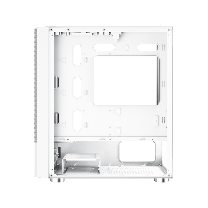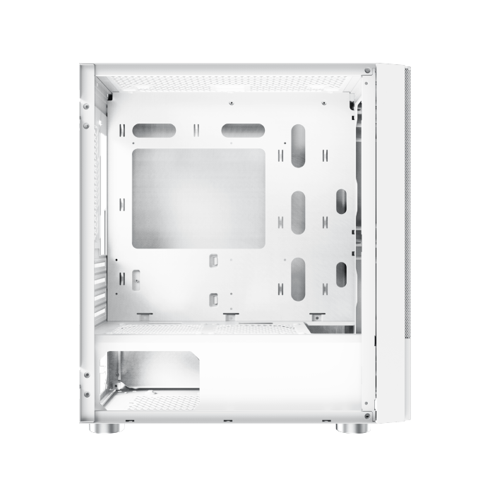 Le panneau latéral en verre trempé permet de mettre en valeur l’intérieur de la configuration. Le châssis est conçu en acier, mesh, plastique et verre trempé, garantissant robustesse et esthétique. Le rétroéclairage DRGB offre des effets lumineux personnalisables, tandis que la finition blanche apporte une touche épurée.