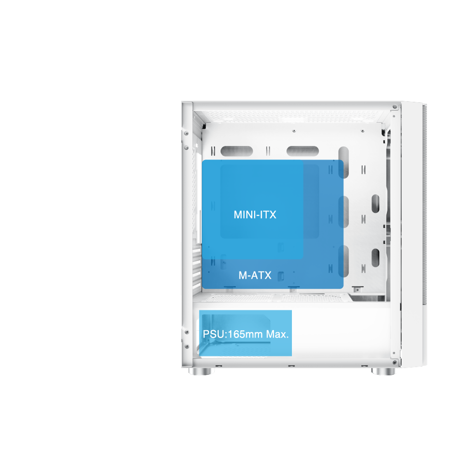 Le Xigmatek Oreo RGB (Blanc) prend en charge les cartes mères Micro-ATX et Mini-ITX. Il propose deux emplacements pour disques 3,5 pouces et deux emplacements pour disques 2,5 pouces, permettant d’installer plusieurs supports de stockage. La longueur maximale pour la carte graphique est de 32 cm et la hauteur maximale pour le ventilateur processeur est de 16 cm.