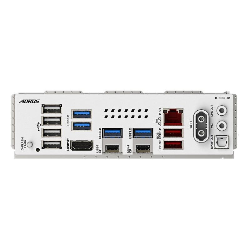 Côté connectique, elle offre de nombreux ports USB : quatre ports USB 3.2 Gen 1, deux ports USB 3.2 Gen 2, un port USB 3.2 Gen 2×2 et deux ports USB4 Gen 2×2. Elle inclut également un port HDMI 2.1, un DisplayPort 1.4, une sortie audio optique S/PDIF et plusieurs connecteurs pour ventilateurs et LED RGB.