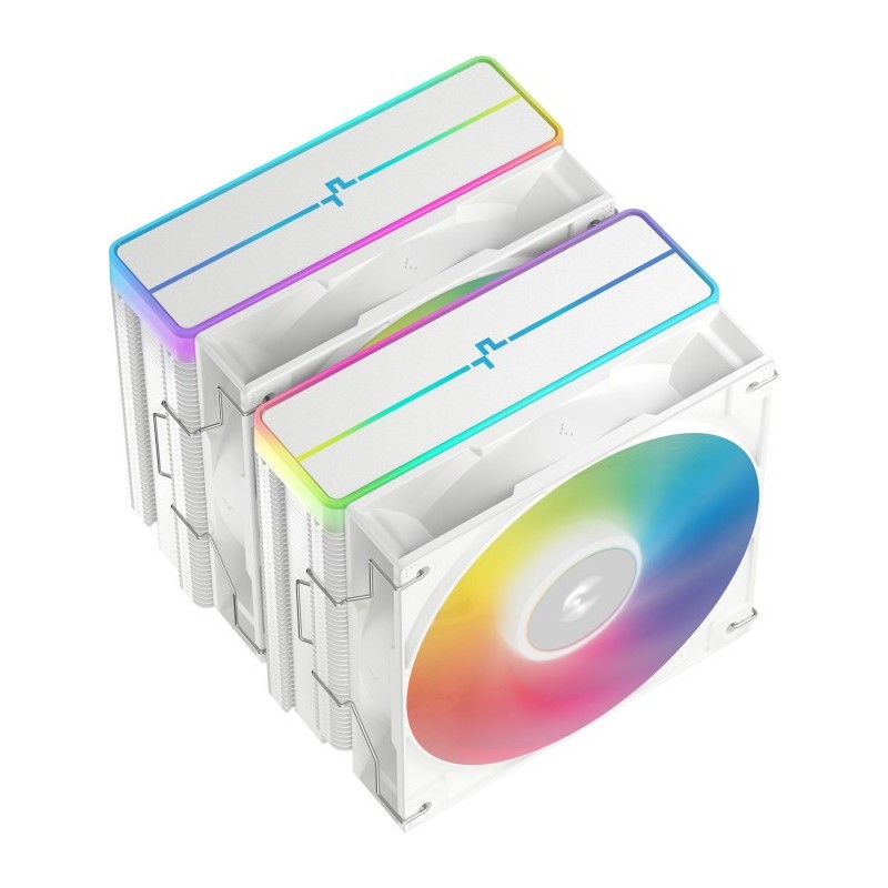 Le DEEPCOOL AG620 WH ARGB V2 Blanc est un refroidisseur d’air conçu pour offrir un équilibre efficace entre performances thermiques et compatibilité avec de nombreux sockets. Ce modèle se distingue par sa finition blanche élégante et son éclairage ARGB, qui s’intègre facilement dans les configurations modernes.
