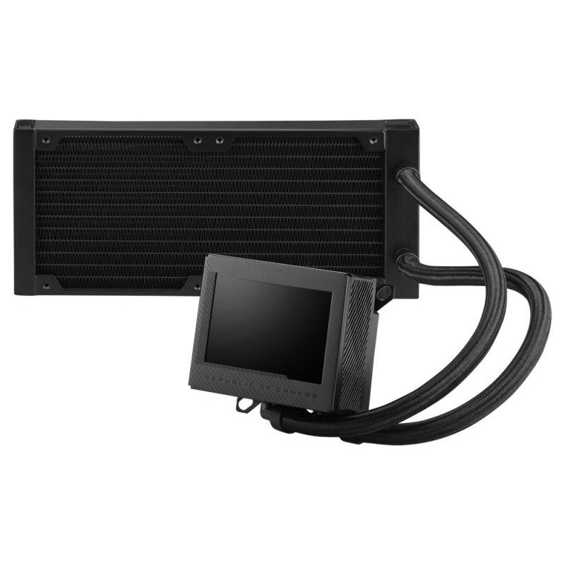L’ASUS ROG RYUJIN III 240 présente un design noir sobre, avec un écran LCD intégré sur le bloc d’eau. Cet écran permet d’afficher des informations système ou des images personnalisées, ajoutant une dimension fonctionnelle et esthétique à l’ensemble.