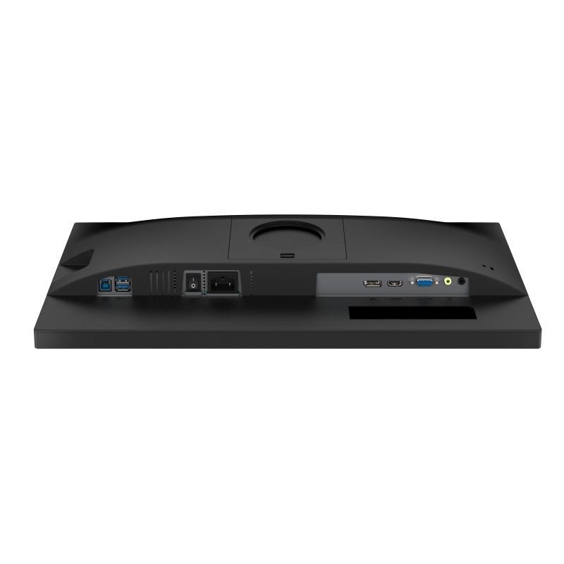 Le moniteur dispose d’un port HDMI 1.4, d’un DisplayPort 1.2, d’un port VGA et d’une entrée audio. Il intègre également un concentrateur USB 3.2 Gen 1 avec 4 ports avals et 1 port amont, facilitant la connexion de périphériques. Les haut-parleurs stéréo intégrés (2×2 W) et la sortie casque audio complètent l’équipement.