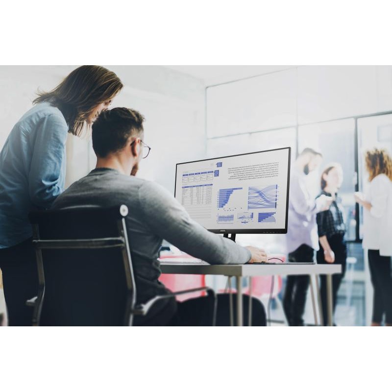 L’écran propose un pied ajustable en hauteur (jusqu’à 13 cm), une inclinaison de -5 à 25°, un pivot à 90° et une rotation sur 180°, facilitant l’adaptation à toutes les configurations de bureau. La technologie Low-Blue-Light et l’écran antireflet contribuent à limiter la fatigue visuelle.